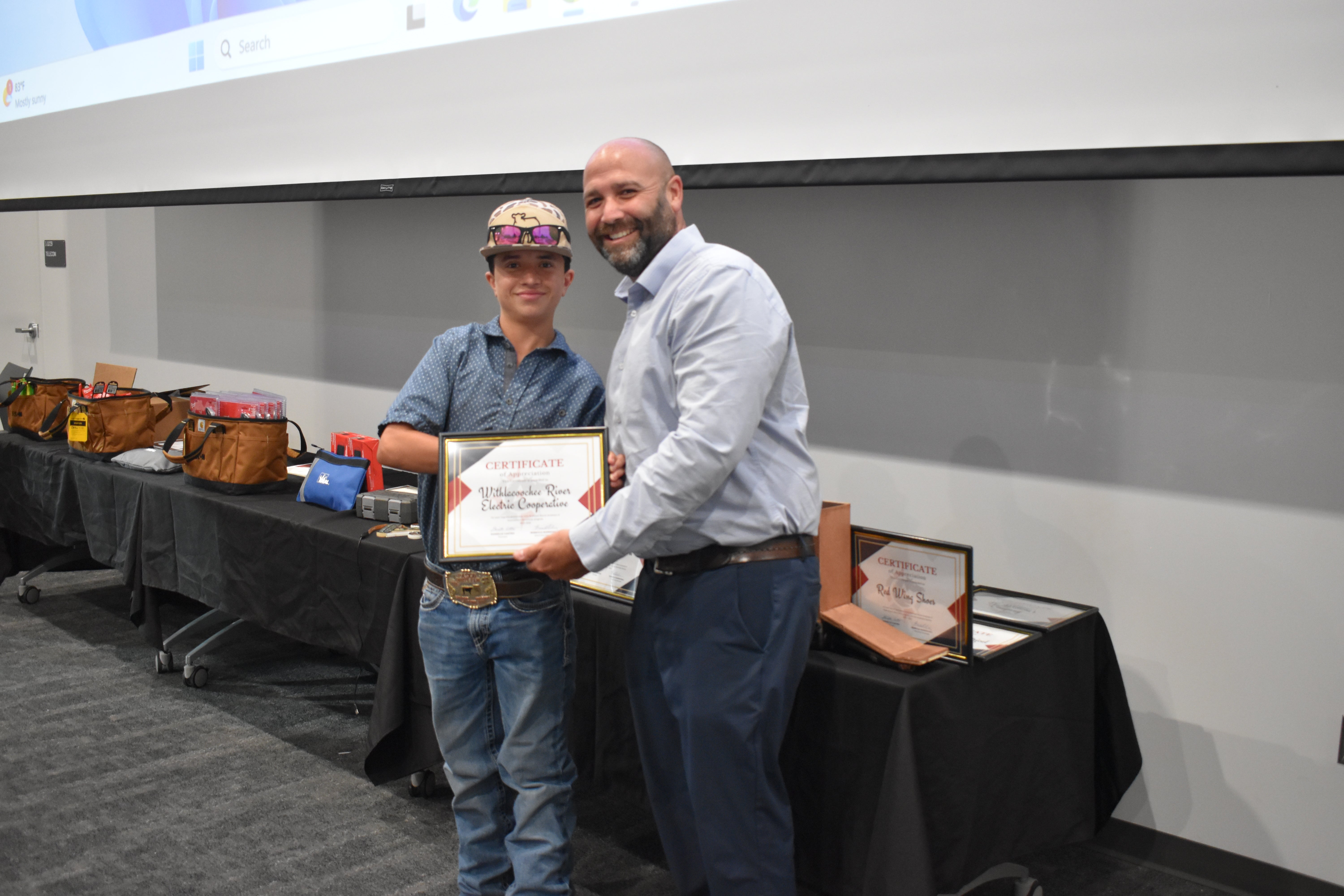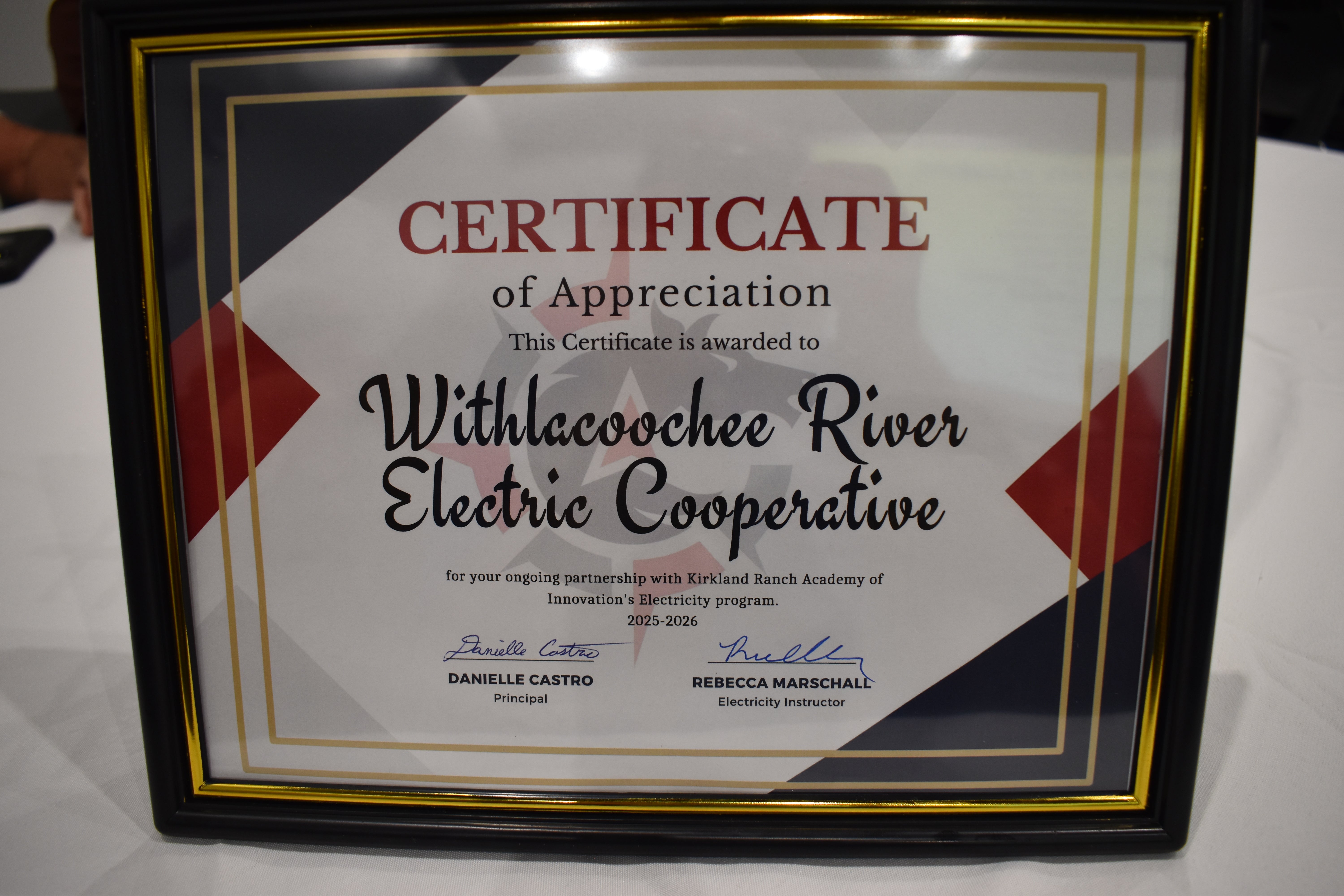 On Friday evening, WREC was proud to attend the 4th Annual Electricity Awards Banquet at Kirkland Ranch Academy of Innovation (KRAI). Charles Sheets from our One Pasco Center district accepted an award and gift from the school for our past and continued partnership and support of their electricity programs there. His son Mason, a sophomore who attends the school, also received an award. Thank you to KRAI for inviting WREC and to all the award recipients. Great job! Serving our community is an honor and privilege.