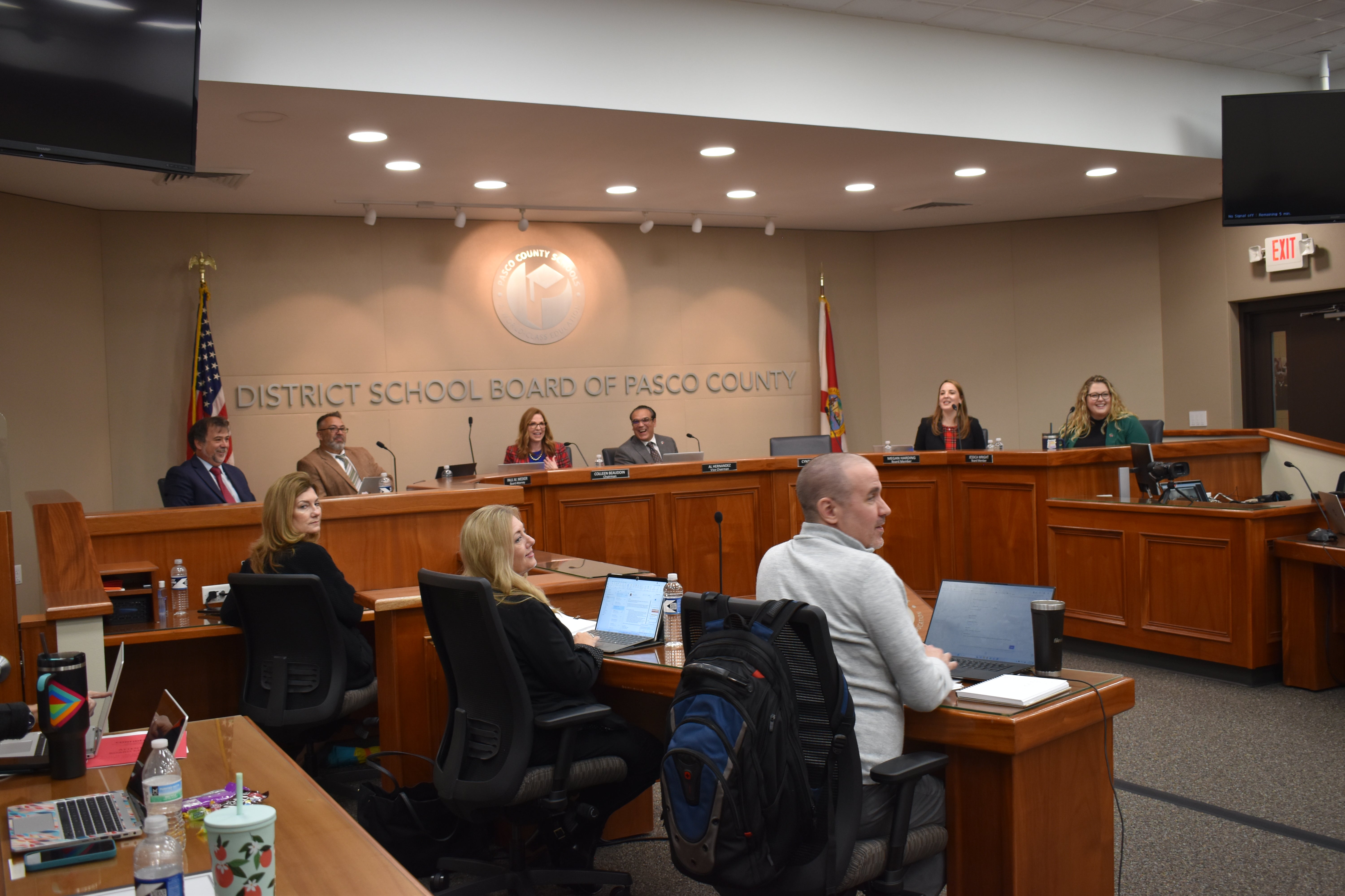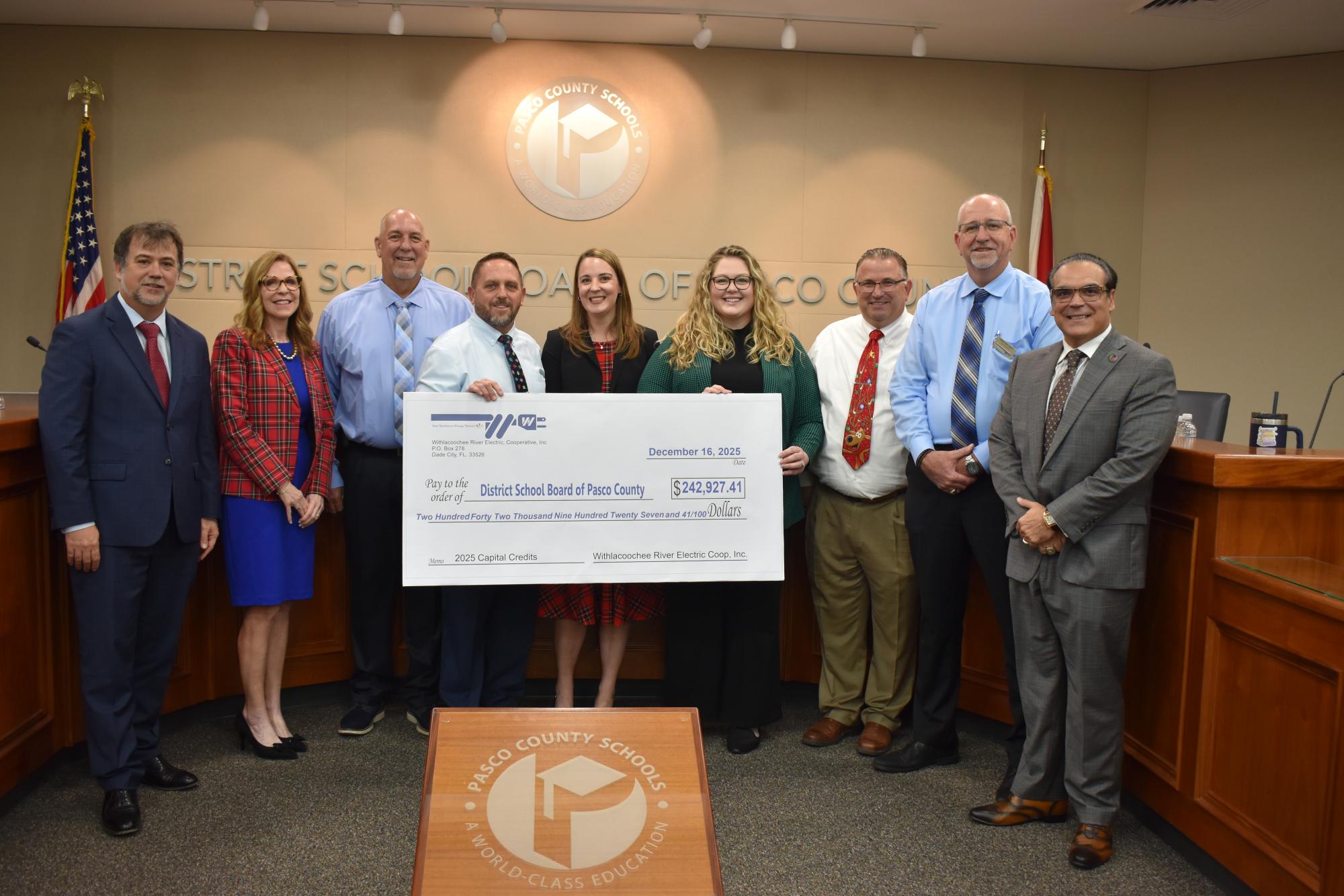 WREC's General Manager David Lambert, along with Bayonet Point District Manager John McCarty, One Pasco Center District Manager Ricky Gude, and Member Relations Manager, Gary Steele, proudly presented the Pasco County School Board with a refund check for $242,927.41 in capital credits!