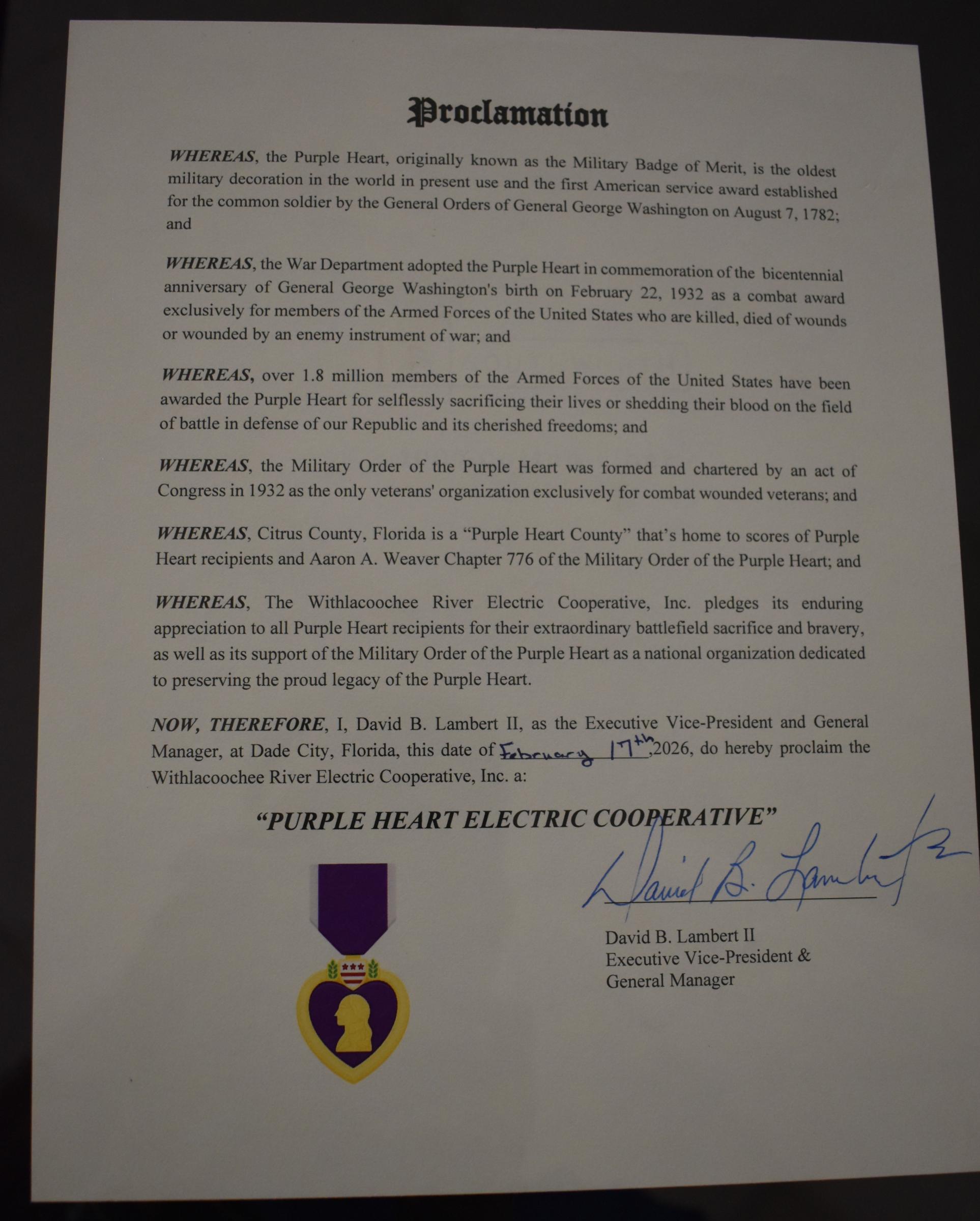 While this honor does not include Member discounts, it represents our deep respect, gratitude, and continued support for veterans throughout our service territory. Being a Purple Heart Cooperative is more than a title—it is our pledge to stand with those who have sacrificed for our country.**