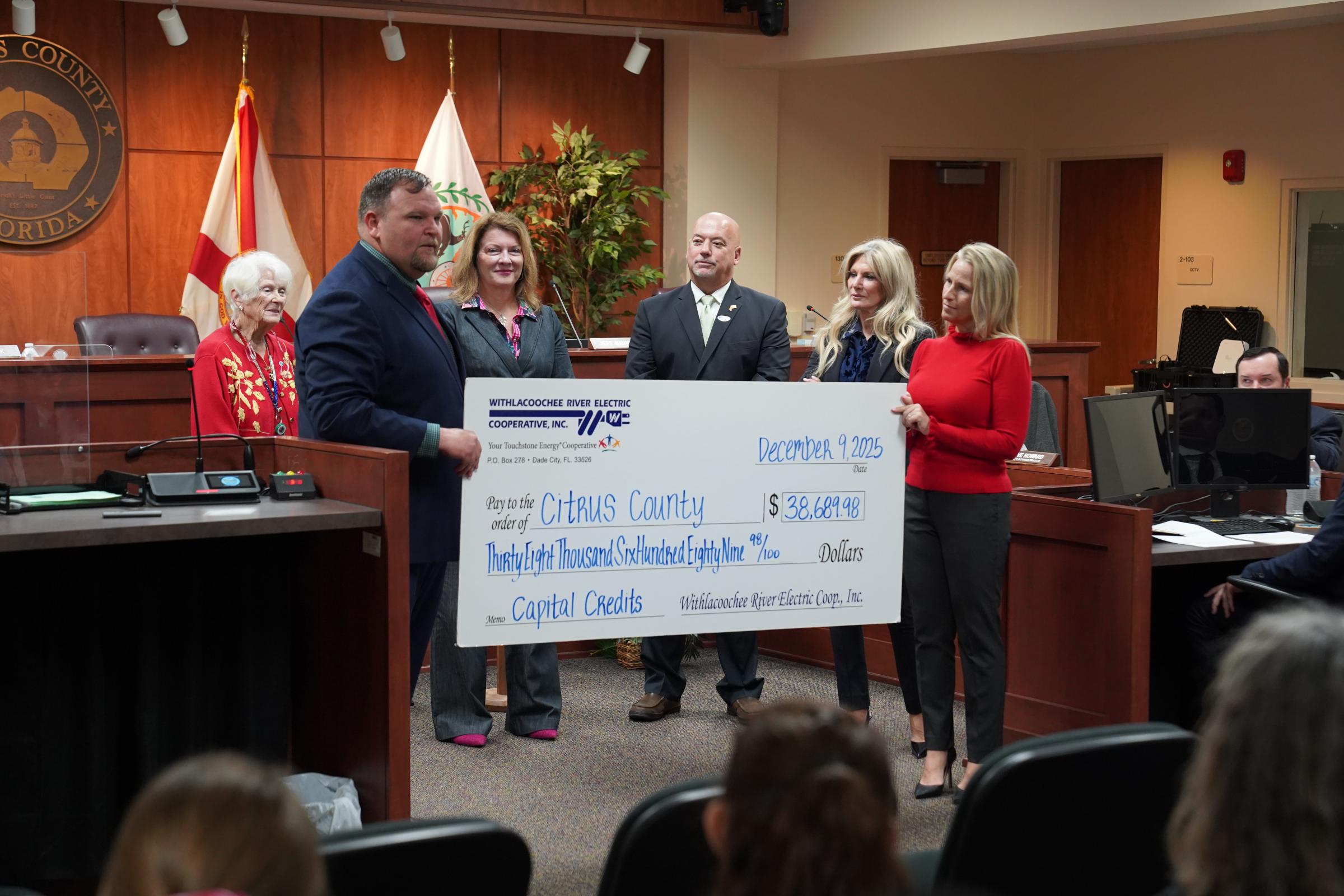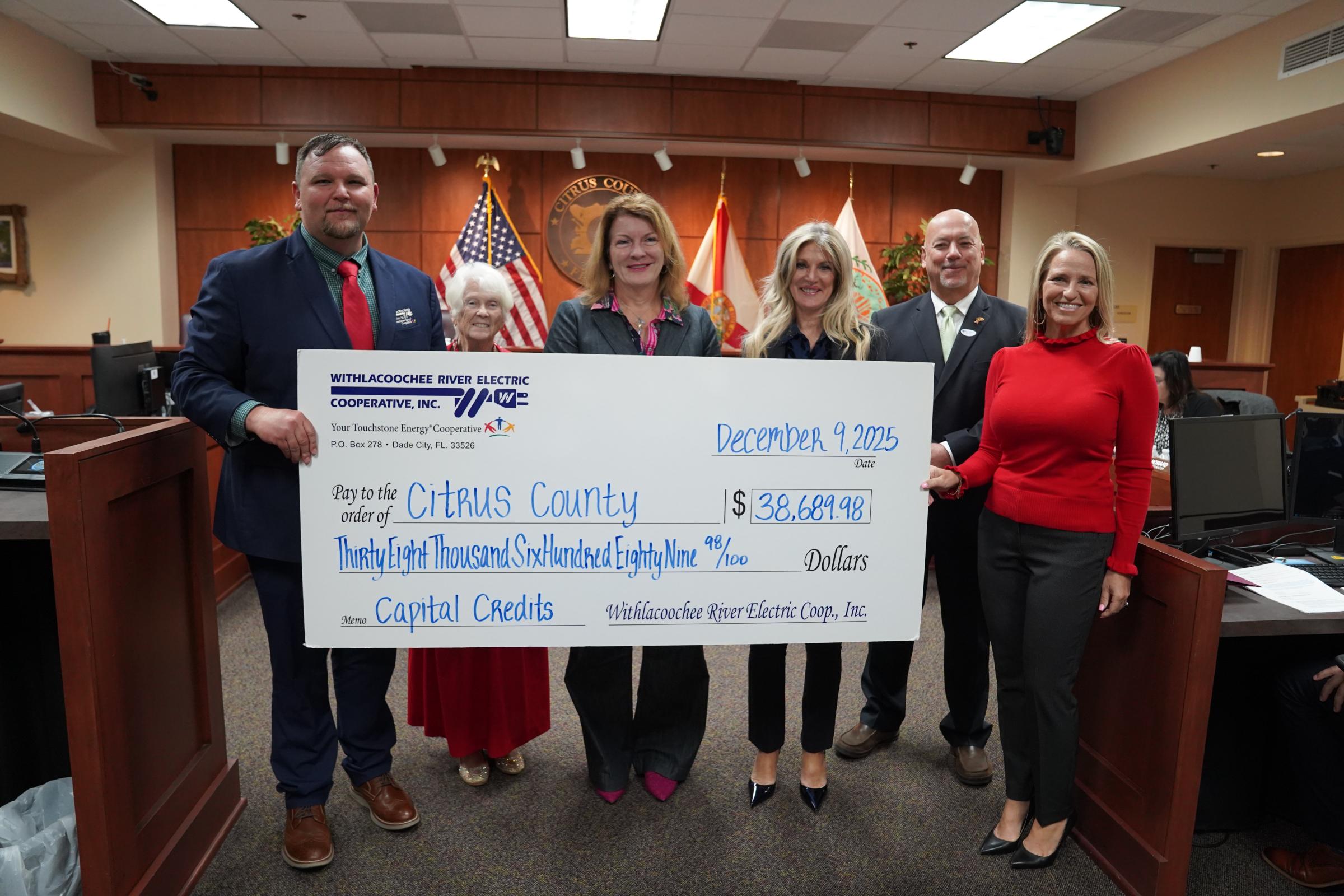 WREC's Crystal River District Manager, Jamen Monbarren proudly presented the Citrus County Board of County Commissioners with a return of $38,689.98 in capital credits!