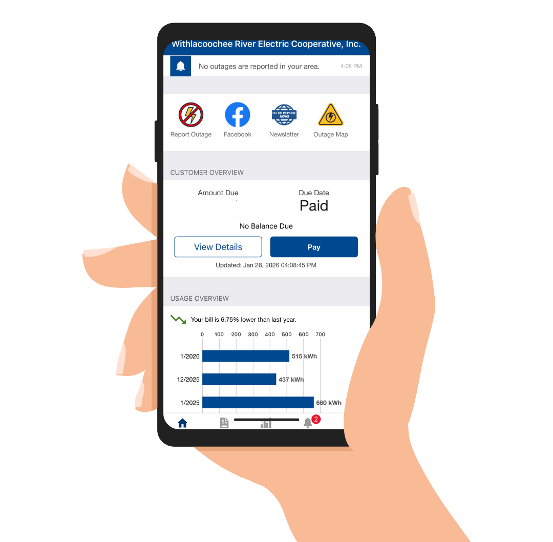 If you are without power please be sure to report the outage through the WREC mobile app, or by contacting your local Cooperative office. Thank you for your patience and understanding. Please avoid all flooded areas and keep away at least 50 feet from downed power lines.